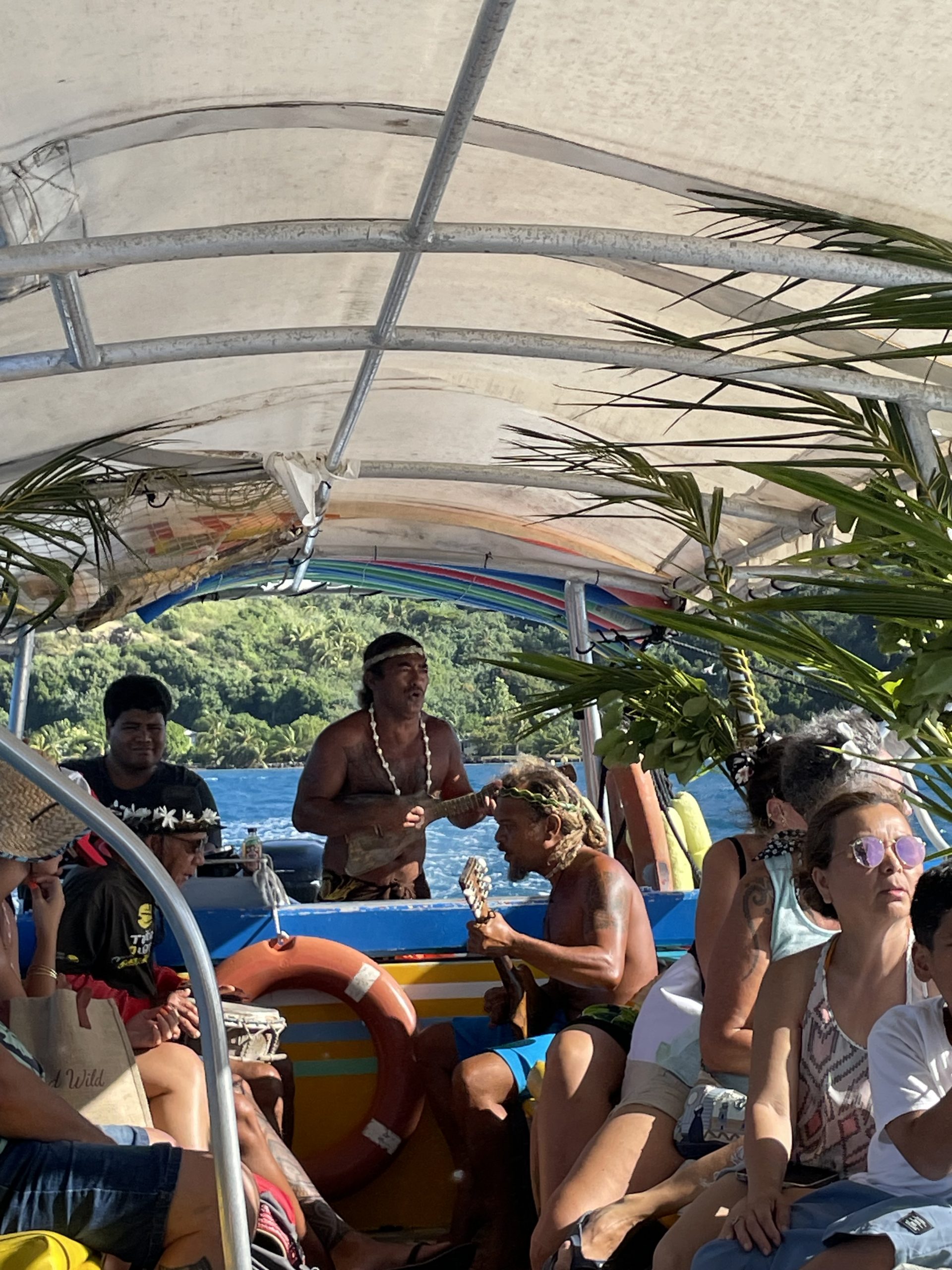 Nous avions réservé avec le Lagonarium, et nous retrouvons une dizaine de personnes dont quelques jeunes mariés (un peu comme nous mais plus jeunes 😜) la mer est très agitée mais nous embarquons dans une grande et belle pirogue, hyper stable…