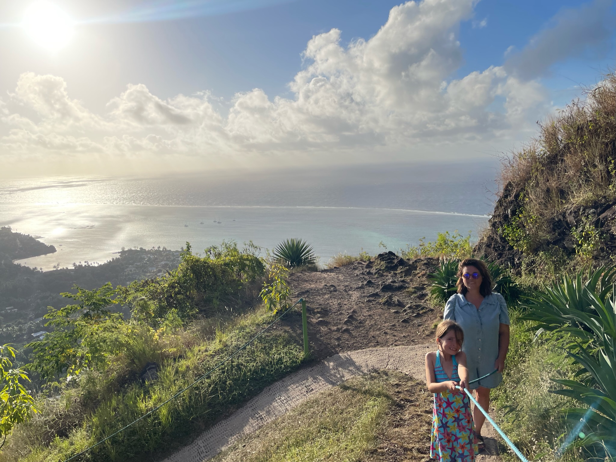 Et pour clore la journee avant le coucher de soleil, on grimpe la montagne magique 🧙♀️ rien de magique dans la montée, un pente très raide pour atteindre le sommet ! Et arrivée au sommet, une vue imprenable sur le lagon de Moorea et ses passes. Magique 🙂