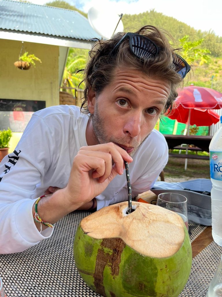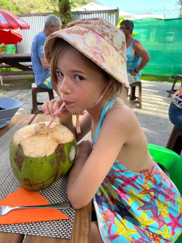 Retour à la plage vers 13h30 et comme toujours en polynésie, après 13h pas simple de déjeuner… Après quelques refus nous finissons donc chez Carameline pour un pan bagnat géant 😋😋 et une petite coco glacée !