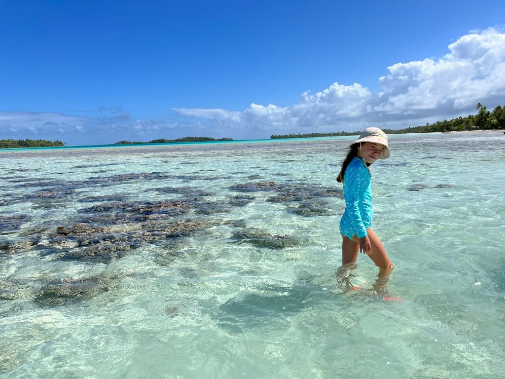 Et finalement nous arrivons au Lagon bleu…petit snorkeling rapidos sans grand intérêt, visibilité faible, puis nous descendons du bateau pour rejoindre le motu. Une bonne quinzaine de minutes dans l’eau…